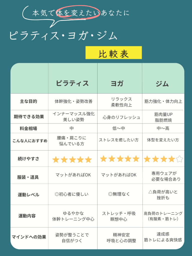 ヨガやジムも魅力的ですが、初心者が無理なく体を整えたいなら、ピラティスが断然おすすめ!